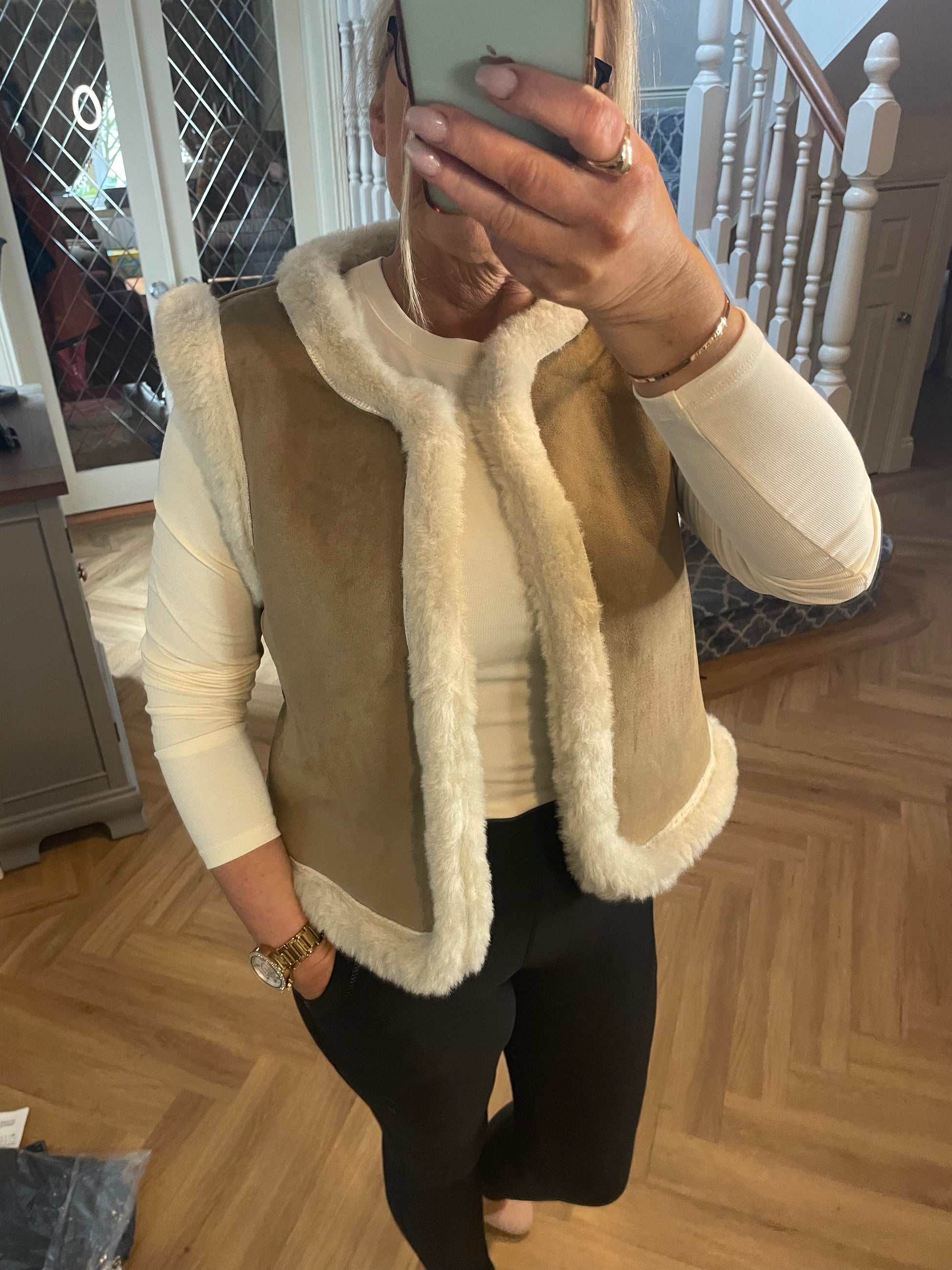 The Faux Suede Gilet in tan offers versatile layering for various occasions. Designed in a one-size format, it accommodates different body types while providing lightweight warmth. The faux suede fabric enhances durability and comfort, making it suitable for extended wear in varying climates.