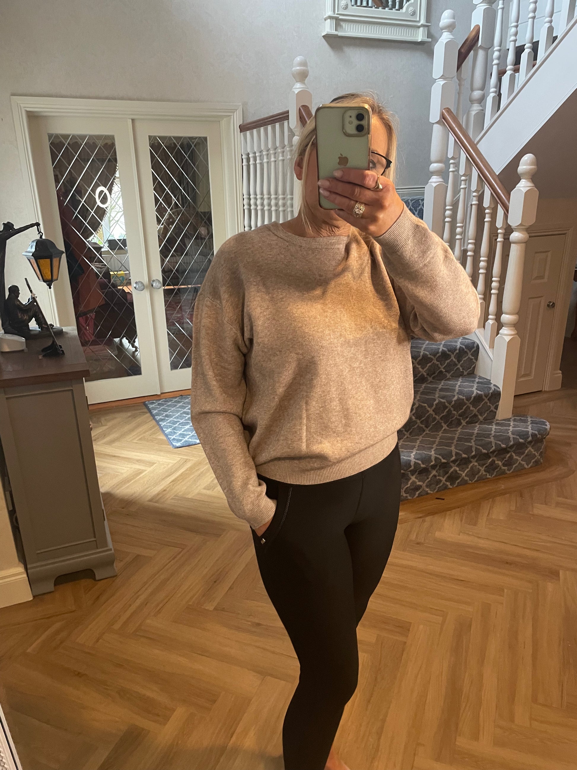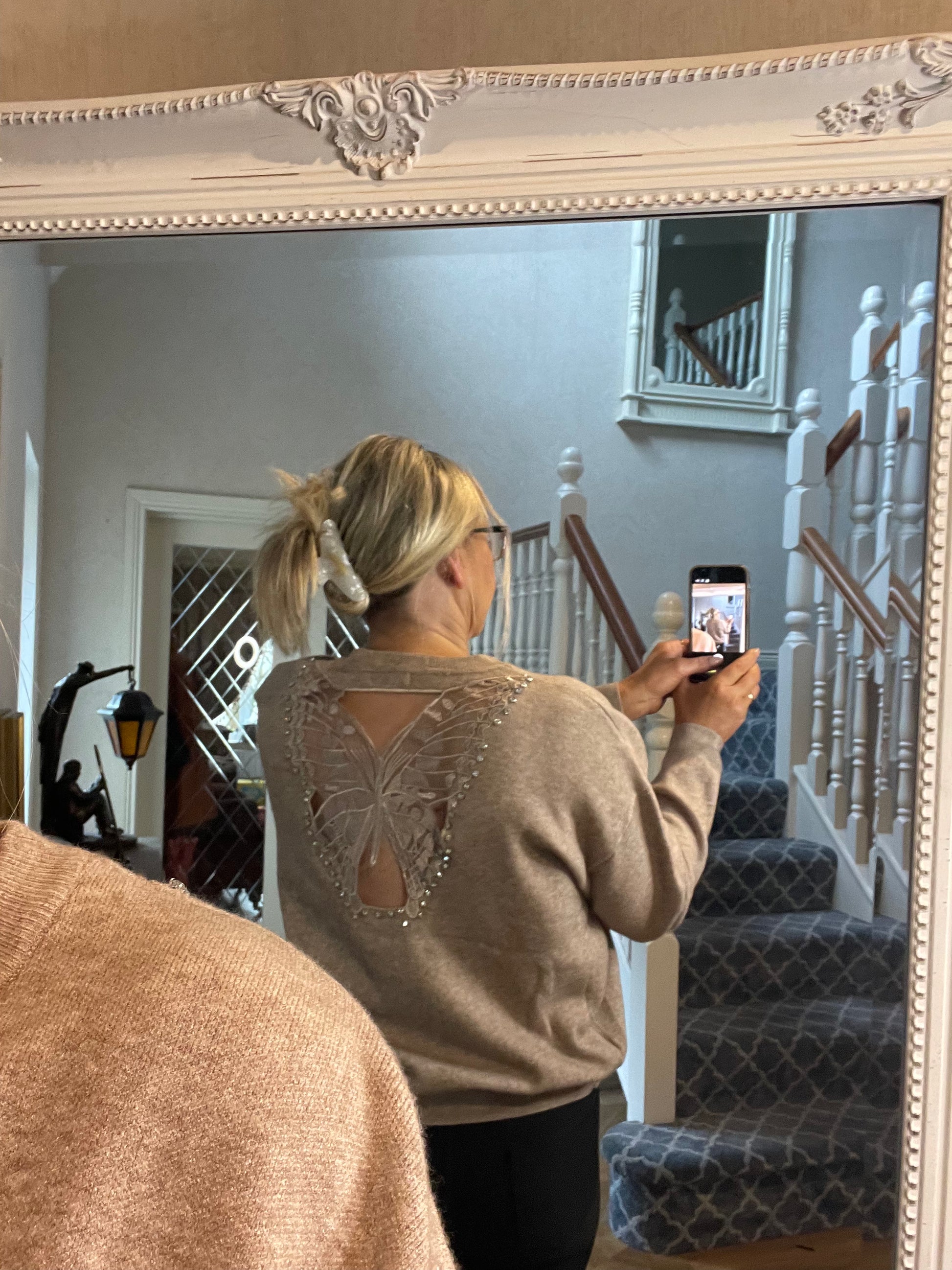The Tan Soft Knit Jumper features a unique butterfly detail on the back, combining style with comfort. Crafted from soft knit material, it ensures warmth and ease of wear. Designed in one size, it offers versatility, accommodating a variety of body shapes while maintaining a sophisticated appearance.